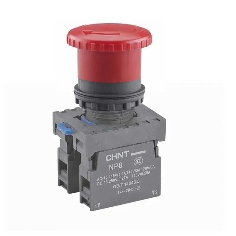 Pulsador emergencia, Cabezal tipo hongo, plastico, Ø40mm, destrabe por giro, contactos 1NC+1NC, grado de protección IP65, marca CHINT